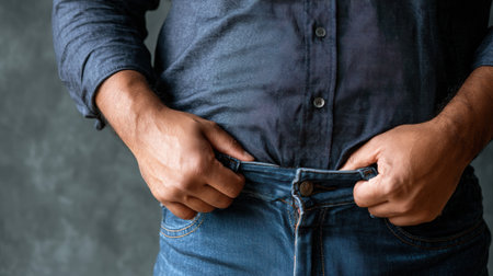 Man showing his belly fat and difficulty closing tight jeans, symbolizing weight gain, body image issues, and the challenge of obesity or unhealthy lifestyle