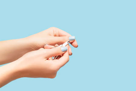 Female hand with blue nail design. Female hand with blue nail polish manicure hold nail clippers. copy space.