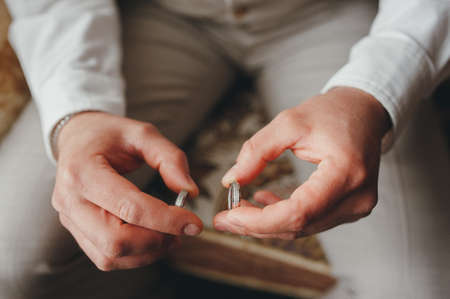 Groom holding two wedding rings on his hand close up