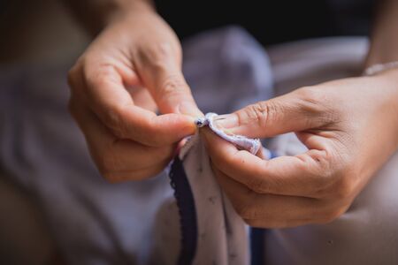 Close-up of woman hand with a needle that sew jeans