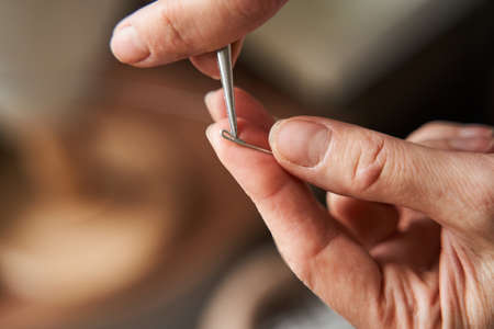 Tailor holding wire and forceps while preparing carcass for the future handmade hat
