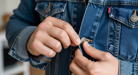 Detailed view of a woman's hands as she expertly fastens the buttons of her stylish blue denim jacket