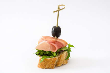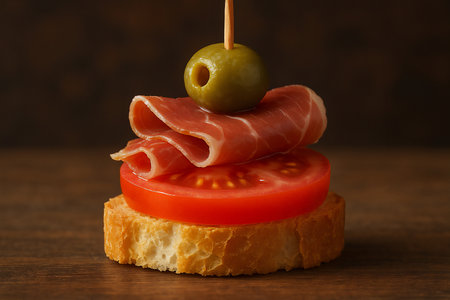 Elegant appetizer made with sliced tomato, cured prosciutto, and green olive on toasted bread, held together with a toothpick. raster colorful illustration.