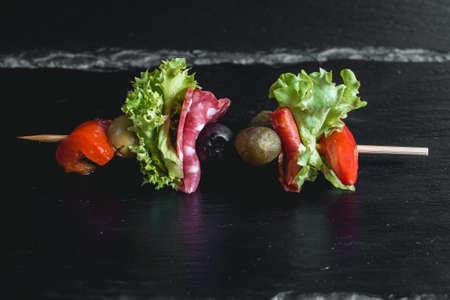 spanish snack, banderillas on skewers with salami, pickling olives, pickles, green and red pepper