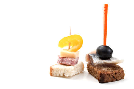 Typical spanish pincho, with smoked salmon and cheese. Isolated on white background.