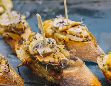 Typical snack of Basque Country and Navarre, pinchos or pinxtos, ready to eat in bar, small slices of bread with topping or mixture of toppings, San Sebastian, Spain, close up