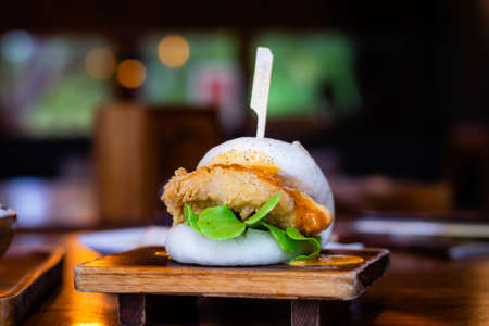 Selective focus Hirata Buns.Japanese traditonal food. Asian cuisine made from steamed buns stuffed with salad and delicious savoury fillings, sandwiches or tacos