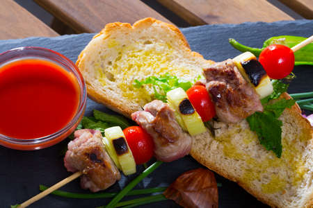 Close up pf delicious chicken breast on wooden skew with fresh vegetables, garlic, paprika fried on mangal barbeque grill