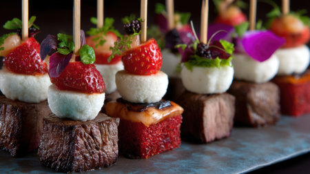 A stunning display of gourmet appetizers featuring fresh strawberries, cheese, and savory beef on skewers, ideal for upscale events.