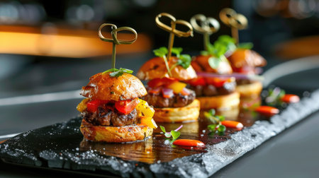 Indulge in an exquisite display of gourmet mini burgers, beautifully presented on a slate plate, perfect for any upscale dining experience.