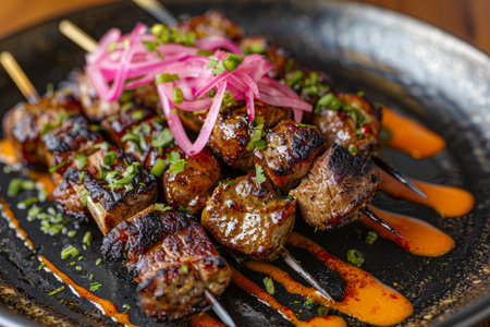 Gourmet Grilled Meat Skewers with Vibrant Pickled Onions and Flavorful Sauce on Rustic Plate AI Generative