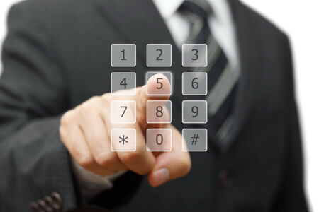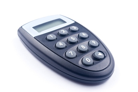 Horizontal top view close up of the keypad of a telephone with numbers showing