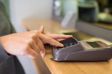 finance, money, technology, payment and people concept - close up of hand entering pin code to card reader terminal