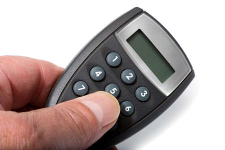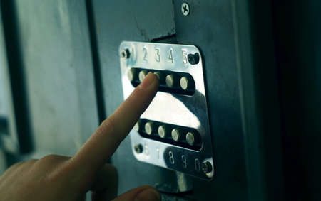 Close-up of hand entering PIN pass code on ATM bank machine keypad