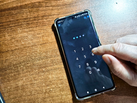 Close-up of a hand using a smartphone to enter a PIN code at home, illustrating a moment of personal privacy and security.