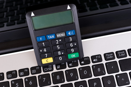 the keyboard of a cash machine, a woman keyboarding. Finance concept