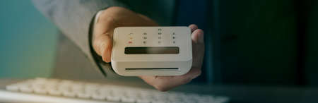 Man holding a payment swipe machine and typing, closeup view. Credit card reader, POS terminal payment concept.