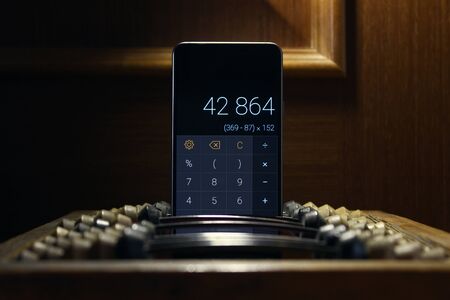 a small calculator with a dark background and copy space on the side. the concept of calculation or accountant