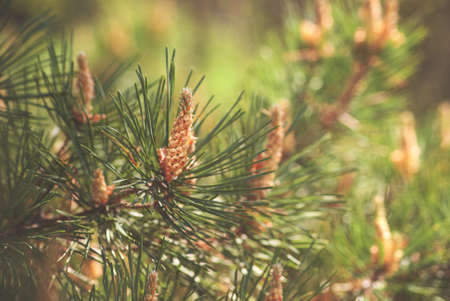 Fresh spring morning colors yellow brown blue needle tree fir branch in a sunny sunset forest park blurry background with free copy space for text. Photo in retro vintage hipster style of processing