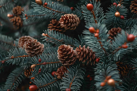 Festive pine tree branches with pinecones and red berries
