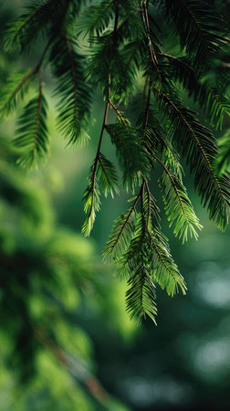 Close-up image of lush evergreen branches. The serene green hues and details intricately celebrate the beauty of winter nature.