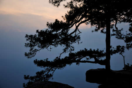 Silhouette of pine at Lom Sak cliff which famous place for watch sunset of Phu Kradueng National Park, Thailand