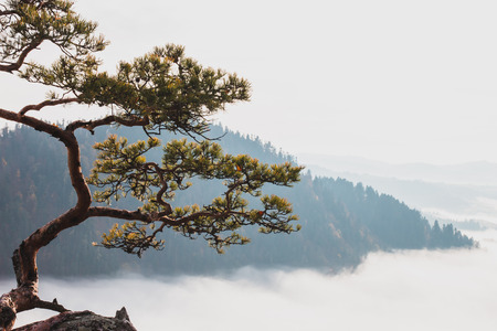 Pine tree on a rocky cliff overlooking a valley filled with mist
