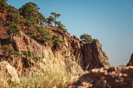 Pitsundskaya pine trees on rocky soil, flora landscape