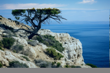 AI Generated. Windswept Tree on Ocean Cliff Under Blue Sky