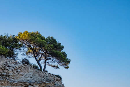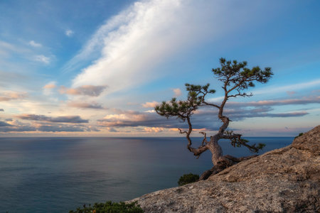 Sea and tree. Spectacular old pine tree on a cliff against the background of the sea. Evening minimalistic marine landscape.