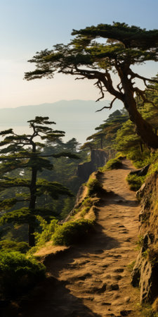a small path winds its way along the rocky terrain, leading to a majestic oak tree. this national geographic photo captures the beauty of the landscape with sweeping seascapes and mountainous vistas. the high-quality image showcases the intricate details of the scene, enhanced by the rim light. the style of kintsukuroi adds a touch of artistry to this captivating onii kei composition. ai generated