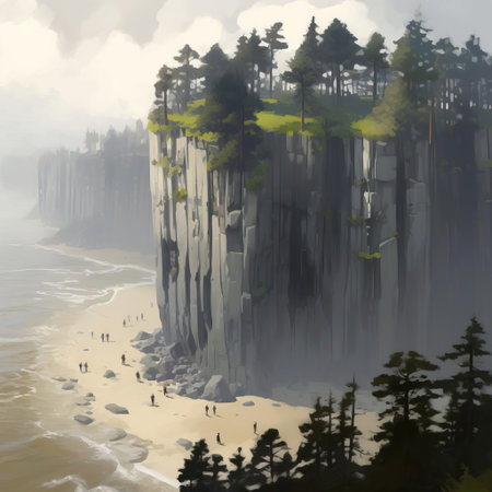 the monumental vistas of the plein air islet, surrounded by extremely tall coniferous trees, create a sense of scale that makes people look tiny, emphasizing the grandeur of nature, while dusty piles and low depth of field add a sense of realism, reminiscent of romaine brooks' style, in this commissioned artwork. ai generated