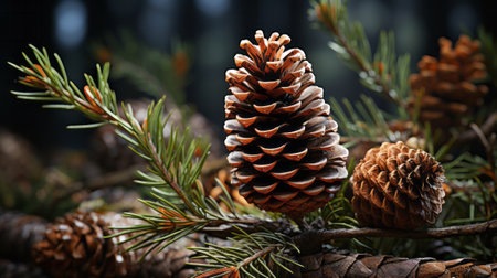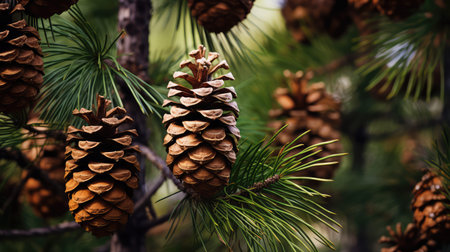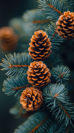 Close-up of pine cones amidst dark-green needles, capturing the essence of the forest