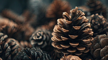 This macro photograph showcases multiple pine cones, emphasizing their intricate texture and natural forms. The image highlights a range of brown hues, with textured surfaces creating a visually rich composition. The dark background enhances the cones' details, suggesting potential uses in advertising, design projects, or editorial content.