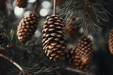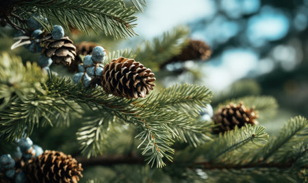 A close-up captures a decorated Christmas tree with pine cones and small lights. The composition is set against a soft, blurred background, highlighting the texture and details of the natural elements. This image is suitable for festive season content, editorial illustrations, and commercial design purposes.