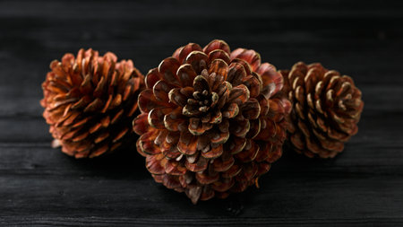 pile of fir cones on black plastic background
