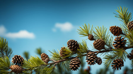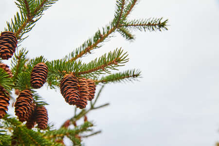 Pinecones on pine tree with empty sky background
