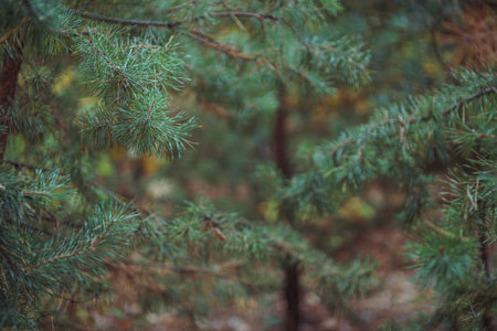 Spruce tree branch in the forest. Selective focus, shallow depth of field.