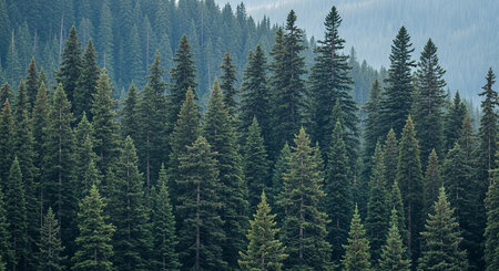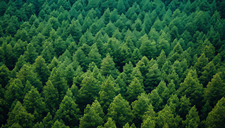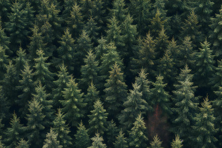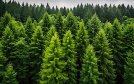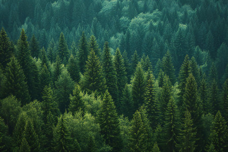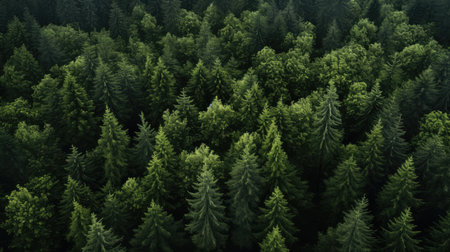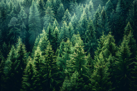 An overhead view reveals a dense forest canopy composed of numerous tall evergreen trees. The scene showcases a variety of green hues, with textures of needles and branches. The composition is framed by subdued lighting. The image suits commercial and editorial applications to depict nature or environment.