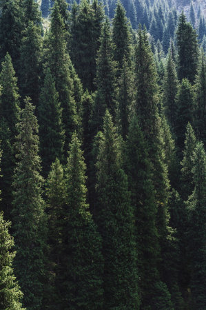 landscape with a beautiful fir spruce forests in Tien Shan mountains in Kazakhstan in summer. Top view from a drone