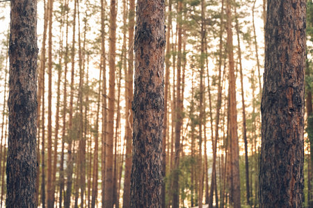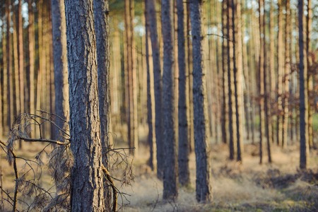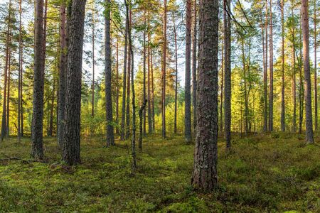 View of the beautiful summer coniferous forest with copy space. Tall brown pine trunks at sunset, sunrise.