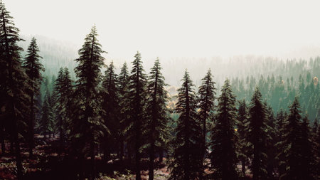 This captivating image showcases a misty forest where tall evergreen trees rise through a gentle fog, creating a serene and tranquil atmosphere perfect for nature lovers.