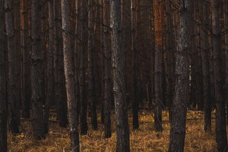 Landscape of autumnal pine forest. Photo with vintage mood effect