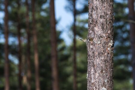 Pine forest, close up trees. Wilderness park, nature.