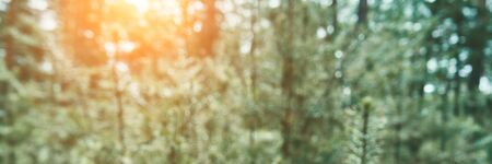 background blur Natural wooden front view. Spring forest concept. Sunrise in woodland spring background. backlight Design transformation of space. peaceful daylight wallpaper. Horizontal banner.