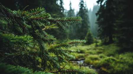 Explore the serenity of a misty forest scene where vibrant evergreen branches frame a tranquil stream, surrounded by towering pine trees and lush greenery.