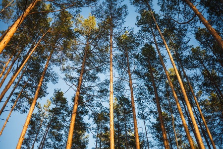 Pine forest in a sunny day. Pine high trees. Close to nature, mental healing with fresh air. Digital detox, unplugged on nature.