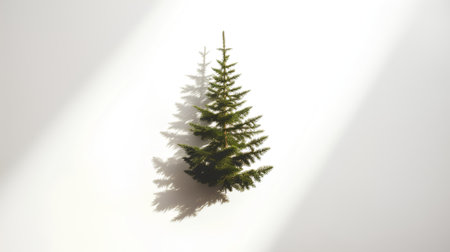 A single, vibrant green evergreen tree, perfectly shaped, stands alone in a vast, untouched expanse of white snow, symbolizing resilience and natural beauty.