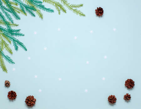 Pine branches and cones located in the lower corner on a blue concrete background, top view. The concept of the new year 2021 and Christmas.