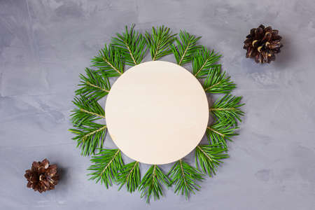Spruce branches are laid out in form of circle, in the middle there is wooden round. Nearby is cone. New Years Christmas concept for postcard, banner. Gray background, copy space, minimalism, flat lay